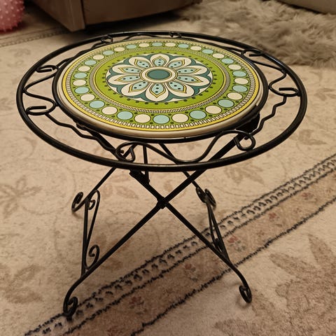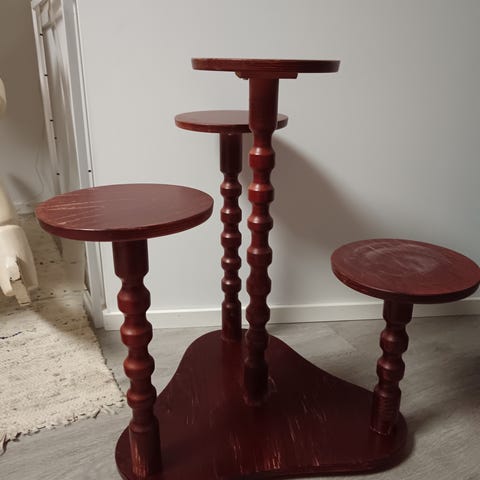 Puinen kukkapöytä, jossa on kolme eri korkeudelle sijoitettua pyöreää tasoa. Pöydän jalat ovat sorvatut ja koristeelliset. Sopii esimerkiksi kukkien tai pienten esineiden esillepanoon sisätiloissa.