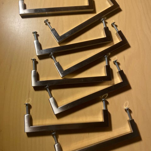 Keittiömuutoksen yhteydessä ylimääräiseksi jääneet käytetyt 29 kpl kaarivetimiä reikäväli 128 mm. Hienoisia käytön jälkiä, mutta yleisilmeeltään siistit. Halutessaan saa mukaan vetimiin sopivat 12 kpl 34 mm ja 46 kpl 22 mm ruuvit. Postikulut ostajalle tai nouto Merimaskusta