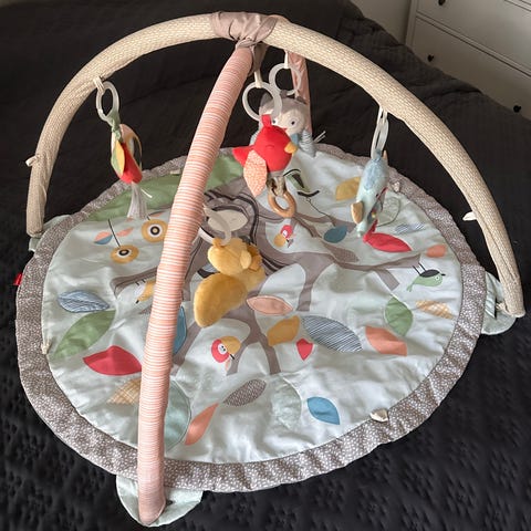 Skip Hop Treetop Friends leikkimatto vauvalle. Pehmeä aktivointimatto, jossa kaaret ja useita irrotettavia leluja, kuten peili, helistimiä ja pehmeitä eläinhahmoja. Käytetty, mutta siistissä kunnossa oleva. Kaikki osat ja lelut tallella. Myös lintulelun ääni toimii. Matto ja tyyny pesty miedosti hajustetulla pesuaineella, leluja ei ole pesty. Kissatalous. Nouto Loviisan Gislomista tai kulkeutuu omien menojen mukana Loviisan keskustaan. Myynnissä myös muualla.