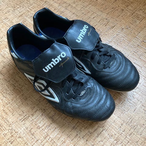 Umbro jalkapallokengät nappulakengät. Koko EU 42 (UK 8,5, US 9,5, 26,5 cm). Väri musta sinisillä nauhoilla ja sinisellä pohjan osalla. Nappulapohja on suunniteltu luonnonnurmelle tai vastaaville alustoille. Päällinen on synteettistä materiaalia.