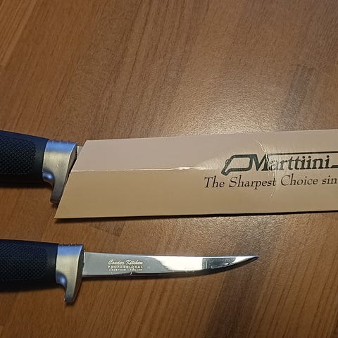 Marttiinin sieniveitsen kahvan päässä on kätevä puhdistusharja, jolla voi helposti poistaa roskat sienistä. Terä on juuri sopivan ohut sienien käsittelyä varten. Kooltaan veitsi on hyvä: veitsen pituus on 18 cm, nahkaisen tupen kanssa 19 cm. Nahkatupessa on lenkki, jolla veitsen voi kiinnittää vyöhön. Terä ruostumatonta terästä, kahva muovia.
