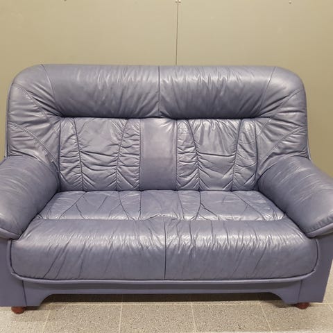 Siistikuntoinen sininen 3-istuttava nahkasohva ulospäin avautuvalla vuodemekanismilla. Istuinkorkeus n. 40cm. Vuodeosan leveys 145cm, syvyys 180cm ja korkeus 40cm.