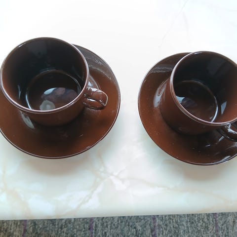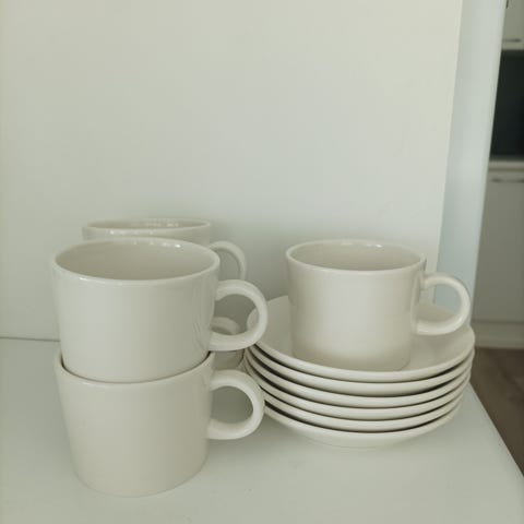 Täysin ehjät ja siistit kahvikupit ja lautaset.Yht 5 kpl.Kahvikupin vetoisuus n 2 dl. Myydään tarpeettomana.Valmiiksi tingitty hinta yht.25 e. Nouto ja käteismaksu.
