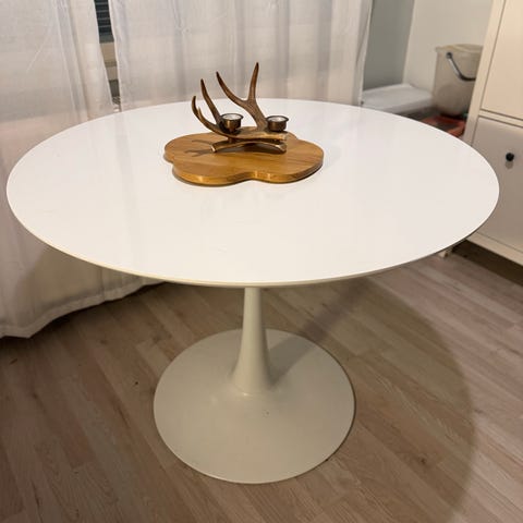 Hyväkuntoinen Ikean valkoinen, pyöreä Docksta-ruokapöytä. Pinnalle on teetetty erikseen lasinen levy, jonka saa helposti pois nostamalla tai liu’uttamalla.