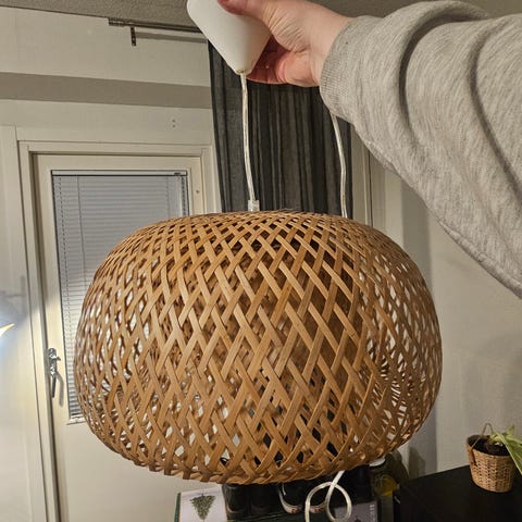Kaksi rottinkilamppua. Mukana myös poltin.