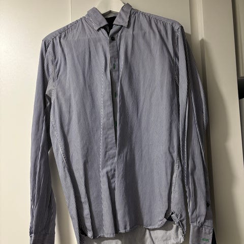 Selected miesten kauluspaita koossa S. Pitkähihainen malli, jossa nappikiinnitys edessä ja kaulus. Paita on ruskea ja siinä on vaaleat pystysuuntaiset raidat. Sopii arki- ja siistimpään pukeutumiseen.