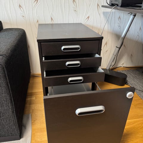 Hyväkuntoinen toimistokalustekokonaisuus, johon kuuluu suuri työpöytä (200x100cm), erillinen siirrettävä laatikosto pyörillä (noin 40x60x80cm) sekä pitkä sivutaso (noin 160x40). Yläosassa on paneelijärjestelmä ja vitriinikaapit, joissa on lasiovet ja alumiinisia avohyllyjä. Takaosan laatikosto noin 235x62x73cm. Mittatilauksena tehdyt laadukkaat kotimaiset tammikalusteet, uutena yli 4000e. Kokonaisuus tarjoaa runsaasti säilytystilaa papereille, toimistotarvikkeille ja laitteille sekä työskentelytasoa tietokoneelle ja muulle toimistotyölle.