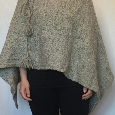 Vaaleanharmaa käsinneulottu villa poncho / hartiahuivi