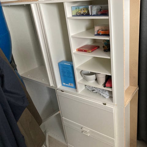 Kolme puista kirjahyllyä. Väri valkolakattu ja ruskea. Takana valkoinen vanerilevy. Hyllyjen paikkaa voi siirtää. Hyllyissä joitain käytönjälkiä, mutta ovat täysin ehjät ja tukevat.