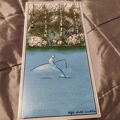 Arabia. Suuri koko 30 cm x 33 cm. Ollut halki ja liimattu. Siitä huolimatta varmasti keräilijälle arvokas kokoelmaan. Ensimmäisessä kuvassa seinällä. Hieno työ, halkeaman raidan saa varmasti jollakin konstin piiloon jos taitaa.