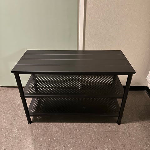 IKEA kenkäteline metallisilla tangoilla. Telineessä on kaksi tasoa kenkien säilytykseen. Päädyt ovat tummat ja tangot metallinväriset. Soveltuu eteiseen tai vaatehuoneeseen kenkien järjestämiseen ja säilyttämiseen lattiatasossa.
