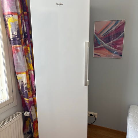 Siisti, puhdas ja toimiva Whirlpool jääkaappi pakastin, korkeus 185 cm, leveys ja syvyys noin 59 cm, hinta vain 145 €.