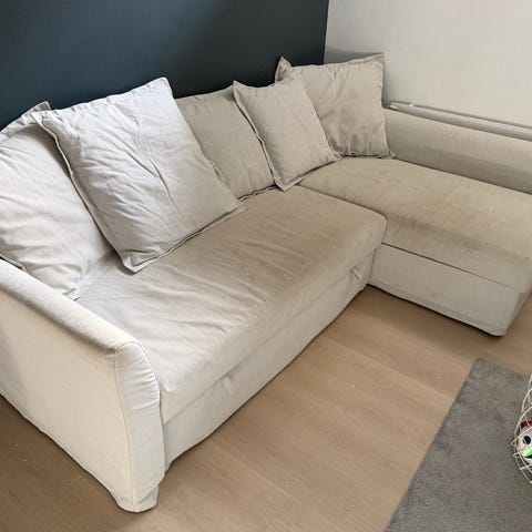 IKEA vuodesohva, jonka makuupinta avattuna noin 140 x 188 cm. Selkänojan korkeus noin 89 cm, istuinsyvyys noin 60 cm ja sohvan kokonaisleveys noin 142 cm. Kuvissa näkyy vaalea päällinen ja tummemmat tyynyt. Sopii kahden hengen nukkumiseen tai istumasohvaksi olohuoneeseen, vierashuoneeseen tai pieneen tilaan, jossa tarvitaan sekä istuma- että nukkumapaikkaa.