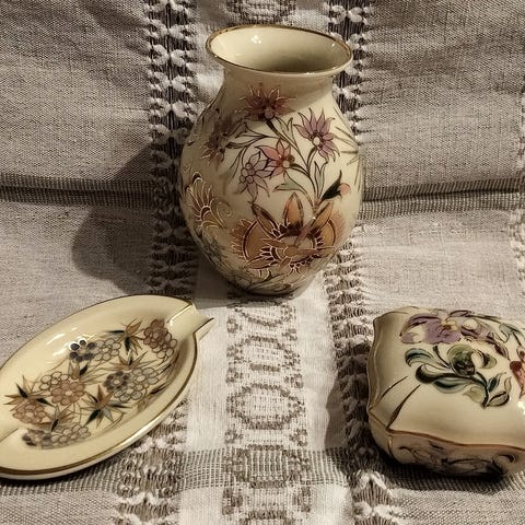 Kalocsa Unkarilaiset käsinmaalatut posliiniset rasiat ja alustat kukkakoristeilla. Kaksi pyöreää kantta ja kulhoa muodostavat rasiat, joissa värikäs kukkakuviointi ja kultareunus. Lisäksi kaksi matalaa, korvallista alustaa samalla kukkakoristeella ja kultareunuksella. Merkki: Kalocsa. Myydään kaikki yhdessä. Hinta70€.