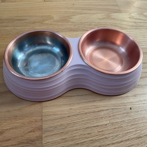 Silikoninen koiran tai kissan ruokakuppialusta. Ovaalinmuotoinen, vaalea/valkoinen alusta, jossa tassukuvioitu pinta. Taipuisa materiaali helpottaa käsittelyä ja puhdistusta. Sopii käytettäväksi ruoka- ja juomakuppien alla suojaamaan lattiaa roiskeilta ja liukumiselta. Uusi.