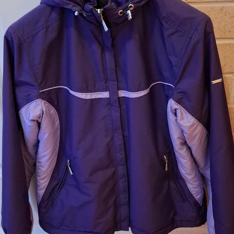 Hyvässä kunnossa oleva ulkoilutakki. Huppu, edessä kaks taskuja ja lantiolla kiristysnauhat.