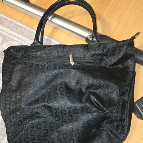 Käsilaukku pehmeää materiaalia, saa suljettua vetskarilla ja nepparilla. Kaksi vetskaritaskua ja kaksi avotaskua. Mitat: leveys alhaalta noin 40 cm, yläosan leveyttä pystyy säätämään nauhoilla. Korkeus noin 27 cm.