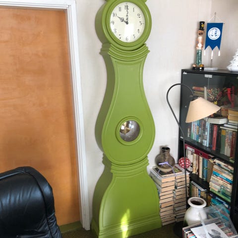 Puuinen kaappikello, jossa kaareva runko ja koristeelliset kaiverrukset. Kellossa on pyöreä kellotaulu yläosassa ja lasi-ikkuna keskiosassa heilurille. Sopii sisustuselementiksi esimerkiksi olohuoneeseen tai eteiseen. Kellon korkeus 82 cm. Voi sijoittaa seinälle tai kaapin päälle.