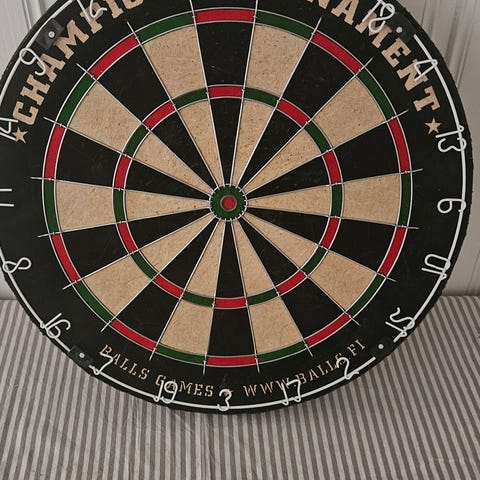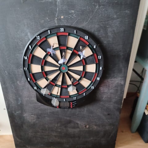 Myydään vähän käytetty ja hyväkuntoinen elektroninen darts-taulu. Taululla on heitelty muutamien päivien ajan. Sopii hyvin aloittelevalle darts-pelaajalle. Mukaan saa 2 settiä alkuperäisiä tikkoja sekä 2 settiä erillisiä tikkoja. Alkuperäisiin tikkoihin saa muutamia varapäitä mukaan. Toimii kolmella paristolla, seinään saa kiinni kahdella ruuvilla. Taulussa automaattinen pistelaskuri.