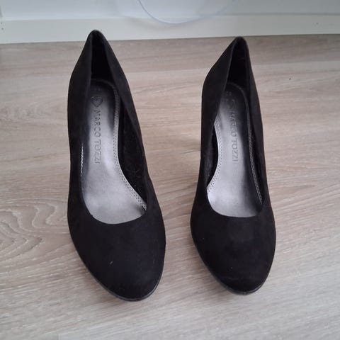 Ellos korkokengät, koko 38. Väri musta. Kengissä on paksu korko ja nauhakiinnitys edessä. Avokärkinen malli, jossa leikkauksia päällisessä. Sopivat esimerkiksi juhla- tai arkipukeutumiseen tilanteen mukaan.