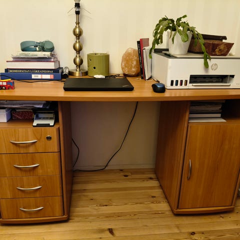 Leveä tummanruskea kirjoituspöytä säilytystilalla. Pieniä käytön jälkiä pöytälevyssä. Haku paikan päältä.