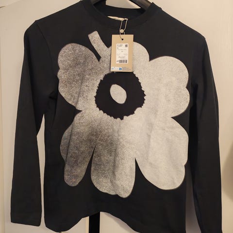 Marimekko Unikko t-paita koossa L. Valkoinen t-paita, jossa edessä suuri Unikko-kukkakuosi punaisen ja vaaleanpunaisen sävyissä. Paita ollut vähäisessä käytössä!