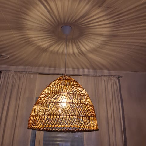 Mattapintainen harmaa roikkuva valaisin töpselikiinnityksellä. Mitat: kuvun halkaisija n. 36 cm, kuvun korkeus n. 20 cm, säädettävän johdon pituus n. 170 cm