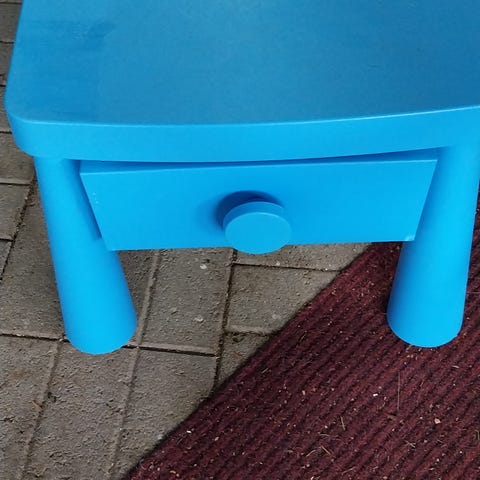 Vaalea yöpöytä. Ylimmässä laatikossa pienet jäljet. Sijaitsee Raumalla.