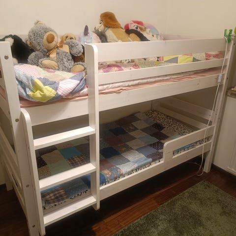 Leo kerrossänky lapsille. ilmoituksessa lukee veke, mutta on leo merkkinen sänky. Valkoinen runko, jossa integroidut portaat ja ylä- sekä alasänky. Sängyn päädyissä ja taustassa on avohyllyjä säilytystä varten. Sopii kahdelle lapselle ja lastenhuoneeseen, jossa tarvitaan tilaa säästävä nukkumisratkaisu. Materiaali vaikuttaa olevan puupohjainen kalustelevy tai vastaava, pintakäsittely valkoinen. Patjat saa lisähintaan mukaansa 20€/patja puolivuotta vanhoja. Sängyn toinen pohjalevy halki kahteen osaan (lastulevyä) saa uusittua jos tarvetta. Meillä mennyt noinkin. Ohjeita ei ole mutta itse löysin netistä. Sängyn voin purkaa valmiiks/kun tulet katsomaan. Kantoavuksi minusta ei ole selkäleikkauksen jäljiltä.