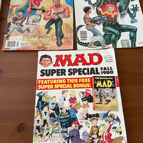 Kaksi amerikkalaista vanhaa Mad super special - lehteä: Mad takes a 100-page look at sex and love 1983 ja Mad’s very best Snappy answers to stupid questions by Al Jaffee 1986. Hintalappujen jälkiä kummankin kannessa, sivut kellastuneita, mutta muuten ehjiä ja siistejä. Yhteishintaan 10 e.
