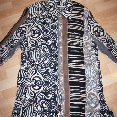 Sisältä hyvinpehmeä lämmin materiaali, joustavaa neuletta. Pituus niskasta helmaan 81cm. Ka-ka 65 cm. Vyötärö vyötärö 51cm. Kaksi taskua,joiden vetoketjuissa kuvan mukaiset"timantit". Hihansuissa napillinen käänne. Koko vastaa M-L kokoa, mitat kertovat tarkemmin. Mahdollinen postitus 8.90€.