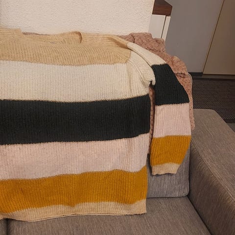 Kuviollinen tasaista neuletta oleva suoramallinen pusero. Materiaali puuvilla 80 ja elastaasia 20 prosenttia. Pyöreä pääntie, pitkät hihat, pituus 70 cm, lantio 104 cm. Puseron yleissävy harmaa-musta-tumman sininen, somisteena suuria kukkia.