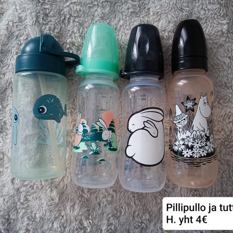 Muumi tuttipullo, tilavuus 240 ml. Läpinäkyvä pullo, jossa mitta-asteikko 20–240 ml ja Muumi-aiheinen kuvitus. Pullo on varustettu kirkkaalla tutilla ja mustalla kierrekorkilla. Soveltuu vauvan maidon tai muun juoman syöttämiseen.