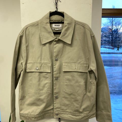 Weekday miesten takki koossa S. Väri beige ja materiaali puuvillaa. Takissa on kaulus ja se on malliltaan rento, sopii arkipukeutumiseen.