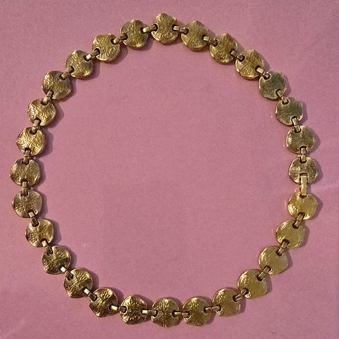 Materiaalina on kupari tai messinki, näyttää kullalta, mutta siinä ei ole kultaista leimaa.