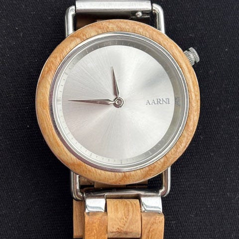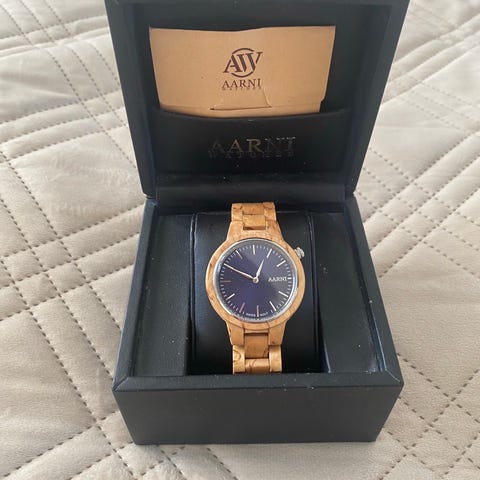 Aarni unisex-rannekello, jossa puinen ranneke ja kuori. Kellotaulu on sininen ja siinä on selkeät tunti- ja minuuttimerkinnät. Ranneke koostuu puulenkkeistä metallisella lukolla. Sopii käytettäväksi sekä arjessa että siistimmässä pukeutumisessa.