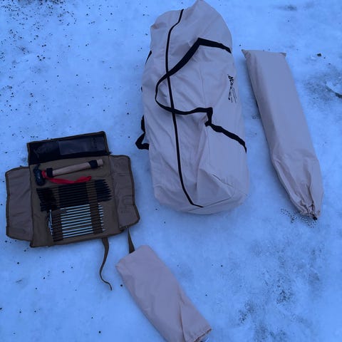 2 person tent and stove with spark arrestor, does not come with stakes/pegs or center pole