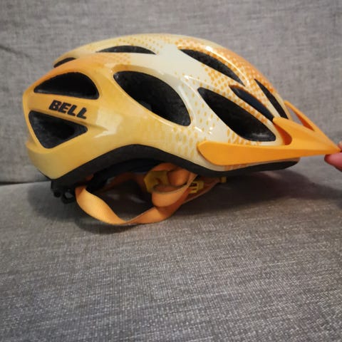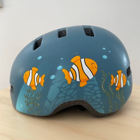Hyväkuntoinen, päiväkoti-/alakouluikäisen päähän sopiva pyöräilykypärä. Säädettävät hihnat ja takana rulla istuvuuden säätämiseen.