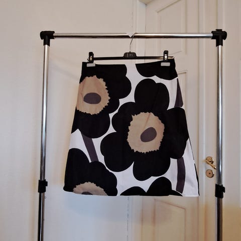 Myydään Marimekon hame. Mallin nimi on AE Garrel Pieni Unikko. Hame on ollut myynnissä Aasiassa. Materiaali on puuvilla. Hameessa on kuminauhavyötärö ja taskut. Vyötärö joustaa hyvin, joten sopii myös XL- ja XXL-kokoisille. Käyttämätön, laput kiinni.