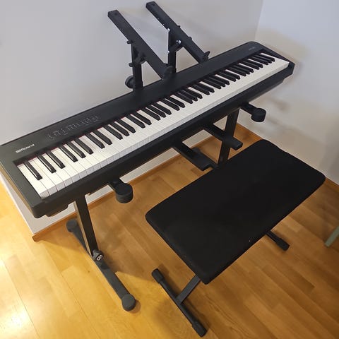 Donner digitaalipiano puuviimeistelyllä. Täysikokoinen koskettimisto ja erillinen kolmen pedaalin pedaaliyksikkö. Liitäntämahdollisuudet takapaneelissa (mm. virtaliitäntä ja audioliitännät). Mukana Donner-merkkinen pianopenkki, jossa tumma istuinosa ja säilytystila istuimen alla nuoteille tai tarvikkeille.