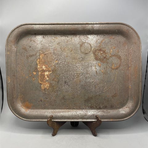 Vintage kiinalainen messinkinen tarjotin, jossa on koristeellisesti kaiverrettu kiinalainen motiivi. Koko 28cm x 19cm.