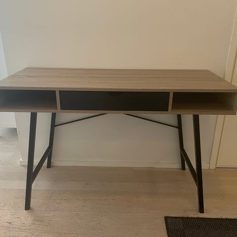 Myydään hyvässä kunnossa oleva valkoinen pöytä. Pöydässä toisella puolella avoin hylly, toisella vetolaatikko.