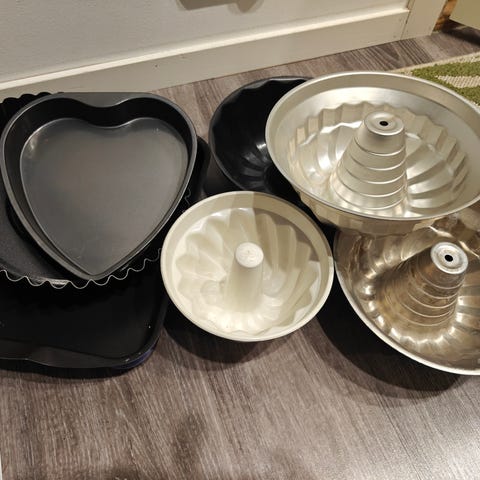 Myydään kakkukupu alustalla ja voileipäkakun alusta kuvulla.