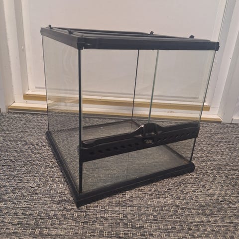 Terraario joka ollut hamsterilla. Hamsteri syönyt tiivisteitä ja ne ovat huonossa kunnossa joten ainakaan akvaarioksi ei sovellu. Hyvä esim hamsterille. Sivussa halkeama ulkopuolella, ei vaikuta sisäpuolelle. yläreuna myös haljennut ulkopuolelta