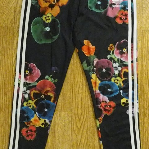 Adidas naisten treenitrikoot, joissa kaunis lintuaiheinen kuosi. Koko S. Kangas jonkin verran nukkaantunut, näkyy lähikuvissa.