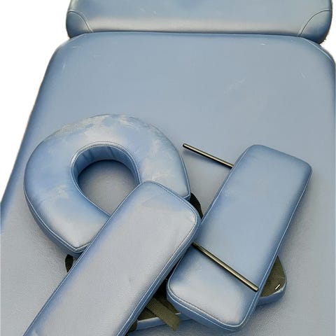 Sininen taitettava hierontapöytä. Pöydässä on pehmustettu pinta ja kasvoreiällinen päätyosa. Pöytä taittuu kasaan ja siinä on kantokahva helpompaa siirtelyä ja säilytystä varten. Soveltuu esimerkiksi hierontaan ja muuhun hoitotyöhön kotona tai työtilassa.