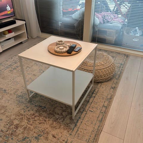 Valkoinen sohvapöytä, jonka halkaisija on 75cm ja korkeus 47cm. Siisti kunto. Eläintalous ja nouto Muhoksen keskustan tuntumasta tai tuonti omien menojen mukana Ouluun.