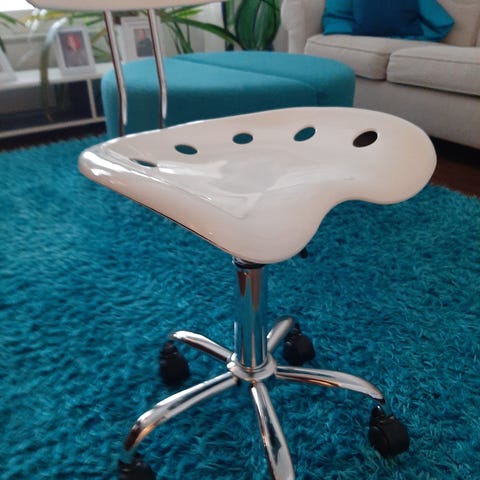 Hyvä kunto, kankaassa vain värjäymää. Korkeus säädettävissä ja selkänoja lukittavissa.