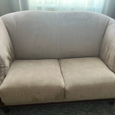 Sohvasi sohva ja nojatuoli. Vaaleanharmaa Lauritzonin Diamonds kangasverhoilu. Kankaat ovat kokonaan irroitettavissa ja pestävissä. Molemmissa 12cm, puiset jalat.
