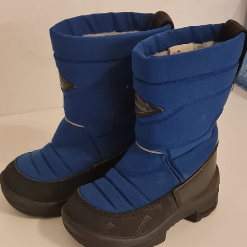 Oikein hyväkuntoiset Kuoman talvikengät koossa 24. Takalenkkeihin solmittu ruskeat nyörit tunnistusta helpottamaan, helppo napsasta halutessaan pois.